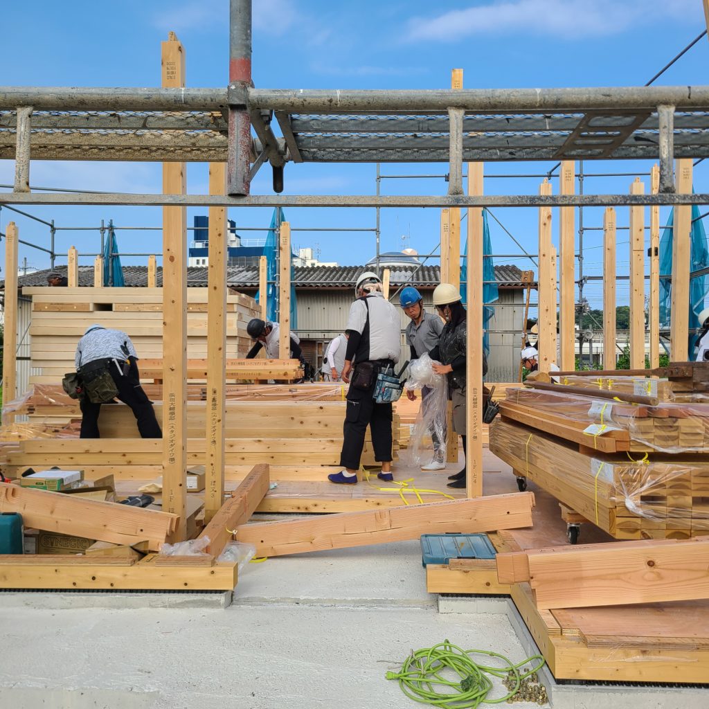 基礎だけだった現場に、職人たちの熟練の手で、住まいの骨組みが次々と組み上がっていきます。