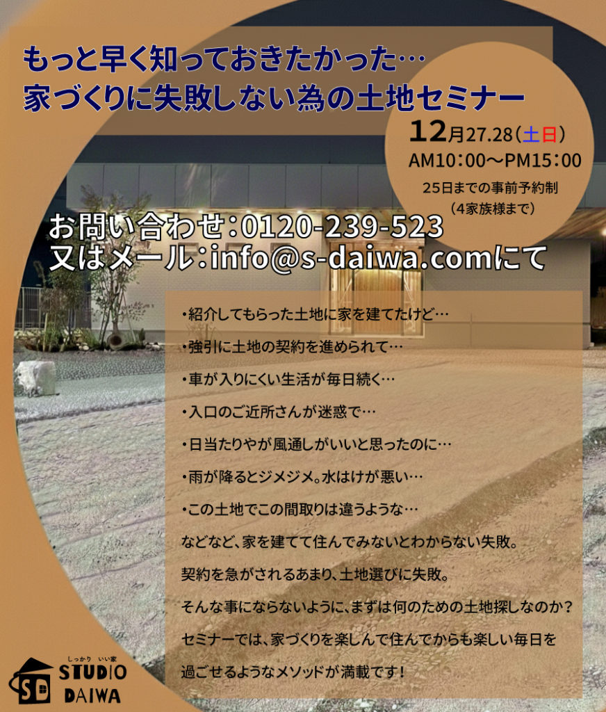📞0896-58-5940(「土地探しセミナーの予約」とお伝えください)