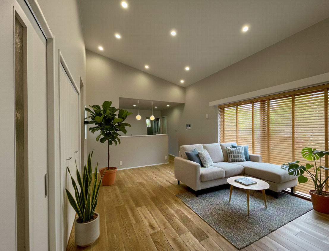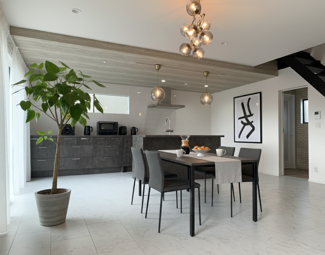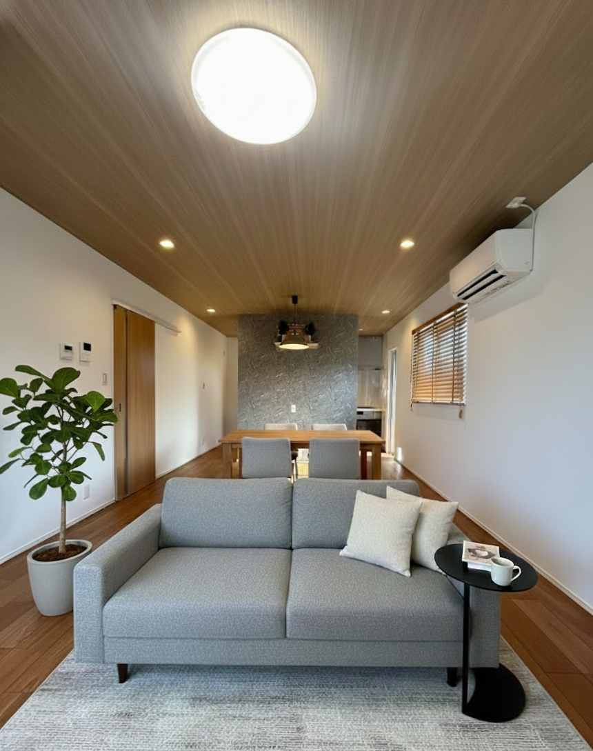 LDKの勾配天井がスタイリッシュな平屋 UA値0.46 W/㎡K C値1.3㎠/㎡ 耐震等級3