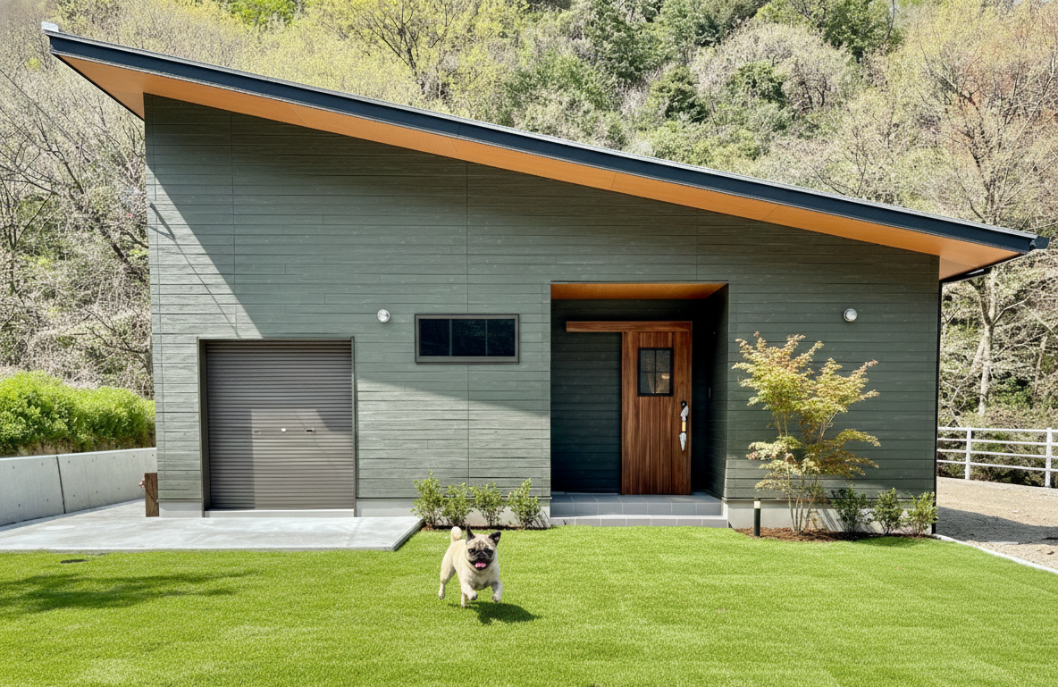 ワンコガレージと勾配天井で開放的な平屋の住まい UA値0.45 W/㎡K 耐震等級3