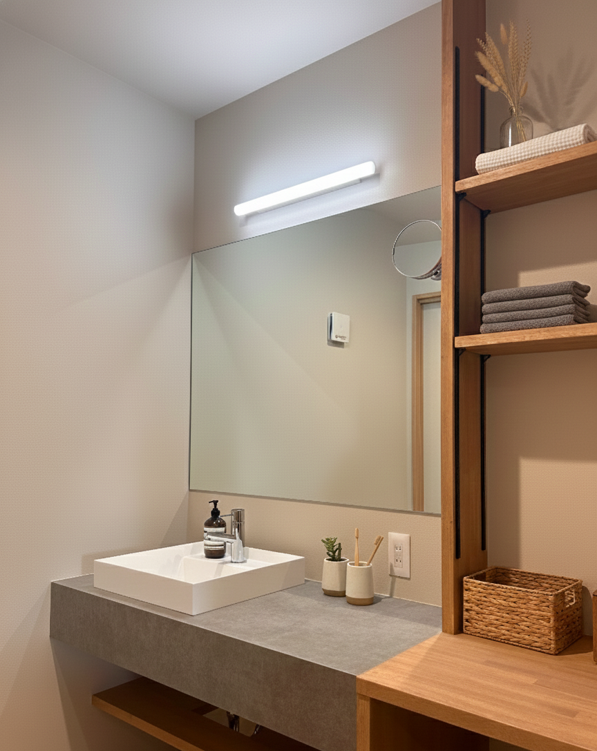 洗面はモルタル風の造作カウンターを採用