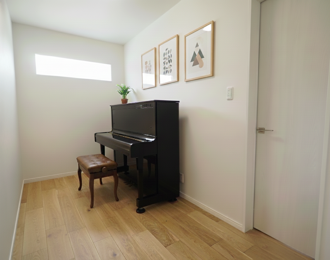 仕事に家事に忙しいご夫婦が癒しと趣味を大切に考え2階ホールにピアノを設置した、家族の想いが笑顔に連なる住まい
