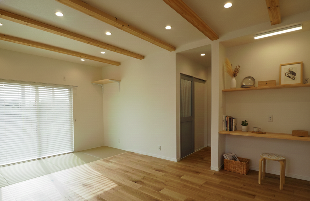 「ちょっとゴロリ」に丁度いい、リビングからフラットにつながる和室もこのおうちの暖かい雰囲気を演出しています。